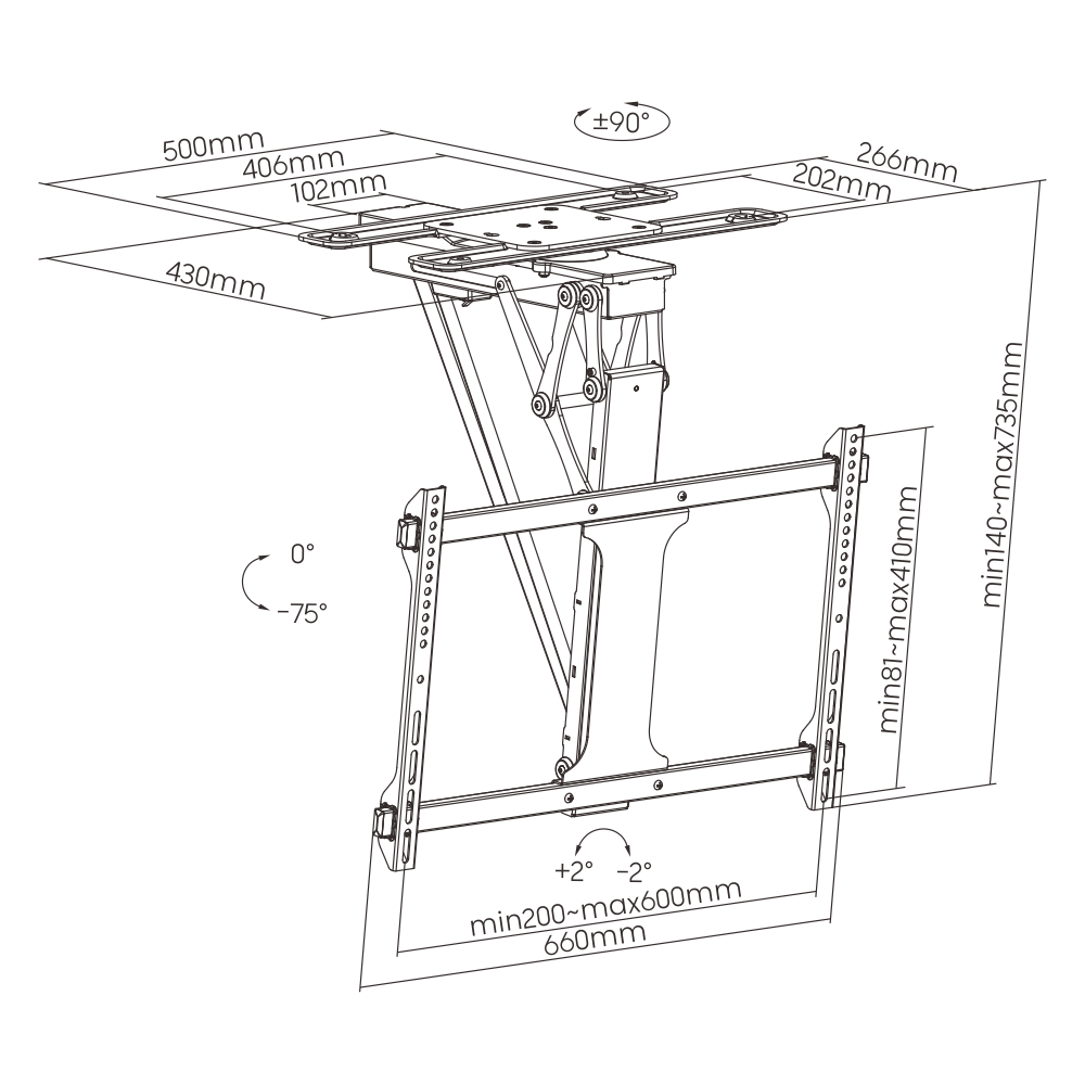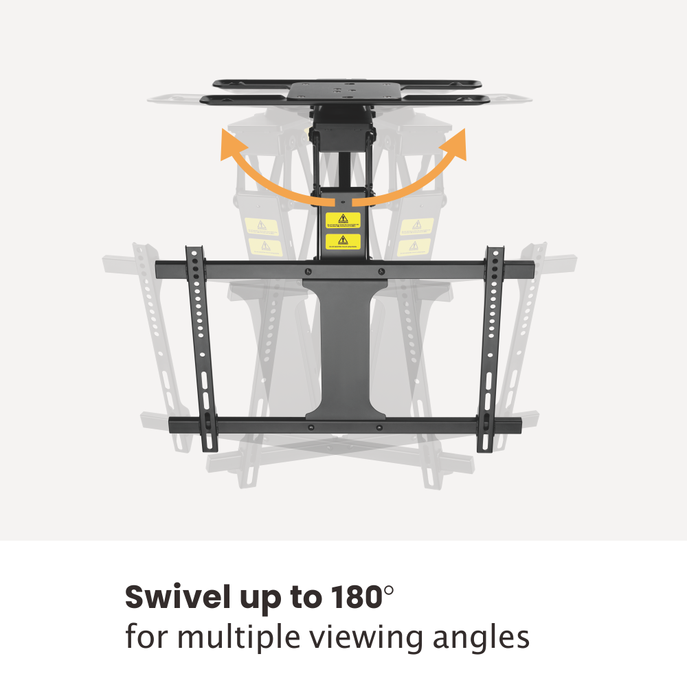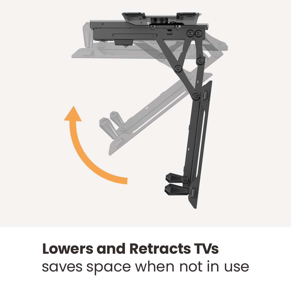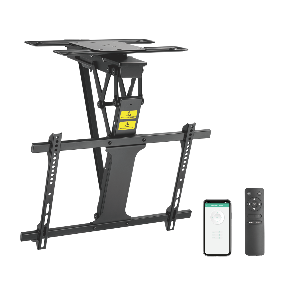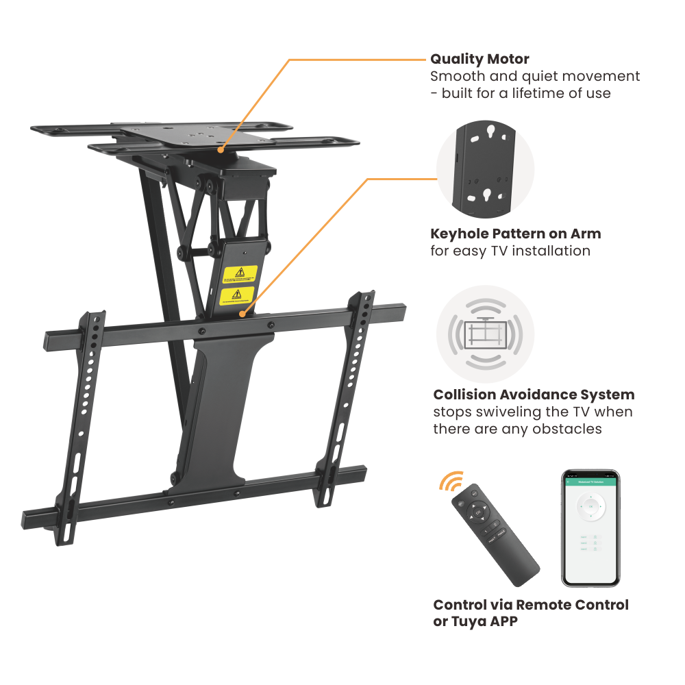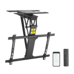 Ceiling Mounts are usually picked by the customers who prefer their TV folded or space saving for the room. Now, via remote/Tuya App, the TVB-107 mounts can swivel up to 180° for multiple viewing angles. Quality motor holds TVs up to 75" (35kg/77lbs) and provides automatic flip up and down function with the press of a button. A balanced mechanism prevents any ceiling vibrations when the TV is in motion. Collision avoidance system stops swiveling the TV when there are any obstacles. Keyhole pattern allows for easy installation and height-adjustment. This mount can be installed on wood ceiling joints. Perfect choice for public or home TV viewing installations!