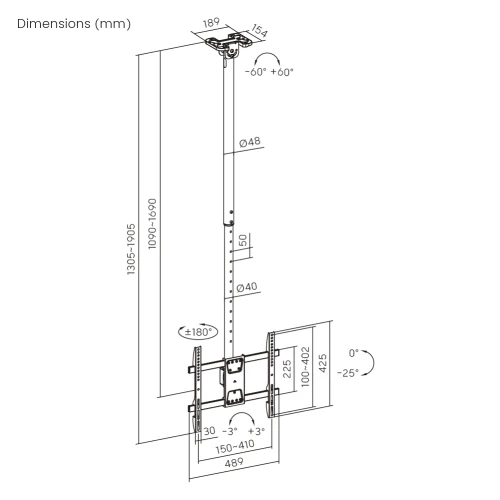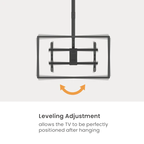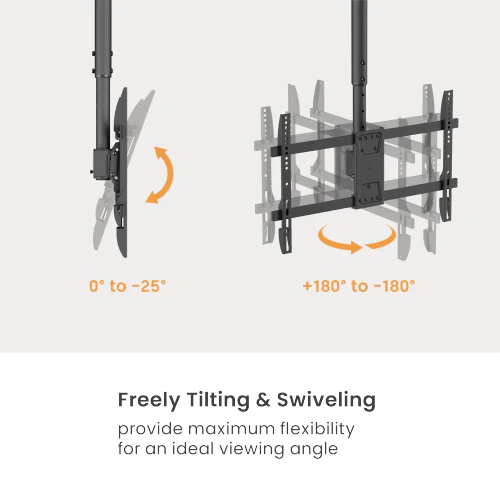 The TVB-22a full-motion TV ceiling mount offers maximum viewing flexibility and is suitable for screens up to 55 inches. With rugged construction, easy mounting and versatile settings, this bracket is perfect for a variety of commercial environments, such as supermarkets, airports, restaurants and conferences. The tiltable ceiling plate effortlessly adapts to both flat and sloped roofs.