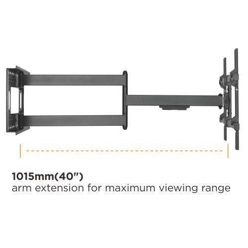 Featuring 1015mm (40")of arm extension and almost limitless swivel capability, the TVB-79 offers maximum viewing range, meeting almost any mounting challenge. Heavy-duty arms provide strong support for larger and heavier TVs up to 50kg (110lbs).TV installation and removal is made easy through a unique quick-release mechanism. Toolless tilting delivers optimal viewing angles. Integrated cable management creates a clean appearance.