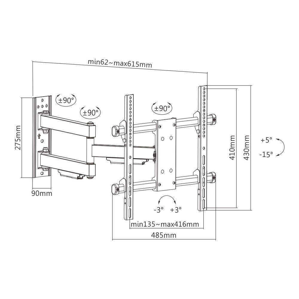 The new solid large full motion mount is constructed with high gauge steel that designed for most 32"-55" flat panel TVs up to 50kg/110lbs. This mount allows you to have your flat panel TV tilted for glare control or optimum viewing angle, pulled out from the wall (615mm extension) and angled towards a separate viewing area. This pre-assembled arm comes complete with integrated cable management and decorative covers to ensure an elegant and tidy look.
