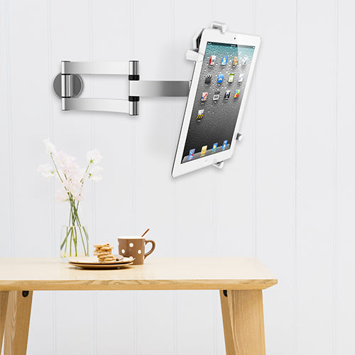 The TVB-94, Multi-functional Adjustable iPad Wall Mount/ Table Stand, makes it alternative for you to place your iPad or tablet on the wall or on the desk and other flat surface. Wall mounting with foldable and stretchable arms can either allow space saving storage or multi-angle viewing. By placing it on the desk, you can easily change it into a folded desk stand to function like any other desk stand.